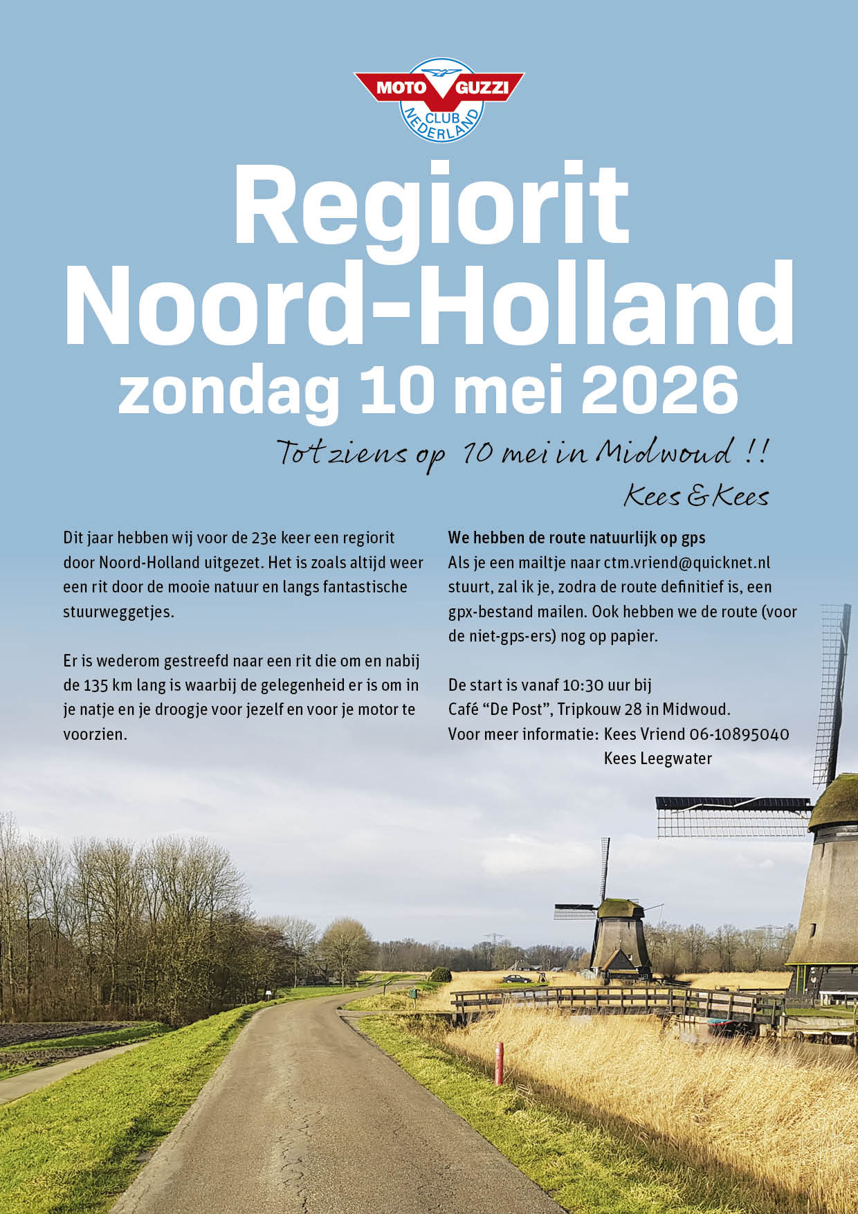 Om zo optimaal mogelijk de kalender samen te kunnen stellen, dient een verandering vroegtijdig aan de redactie te worden gemeld. De regiobijeenkomsten worden georganiseerd door enthousiaste leden van de Moto Guzzi Club Nederland, maar vallen NIET onder de verantwoordelijkheid van de Moto Guzzi Club Nederland.